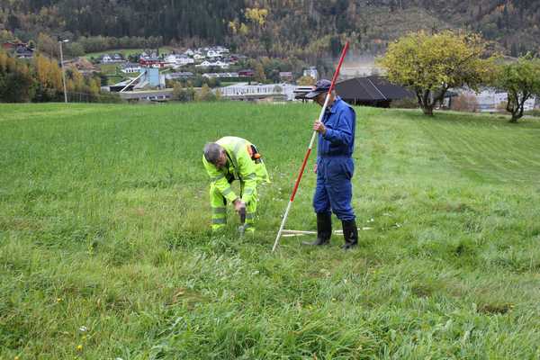 Ca. år: 2020, Høsttur til Loen. Oppmåling av tunteig. Sigurd Lunde (oppmåler) og Håkon slår ned grensemerket.