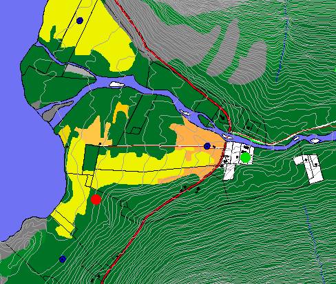 Bruk 2 Knutebruket i Bødal. Raudt punkt viser om lag kvar tunet låg før 1936, og grønt punkt i kvitt område ovanfor vegen viser kvar tunet ligg i dag (2002)
