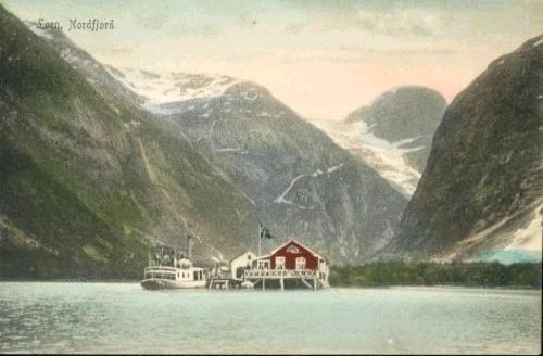 Postkort som viser båt ved kai ved Kjenndalen resturant. Signert G.H. No. 654. Original: Audun Loen's postkortarkiv