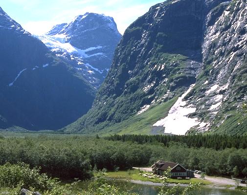 Ca. år: 2000, Kjenndal fjellstove og utsikt oppover Kjenndalen med Kjenndalskuna. Marit i forgrunnen