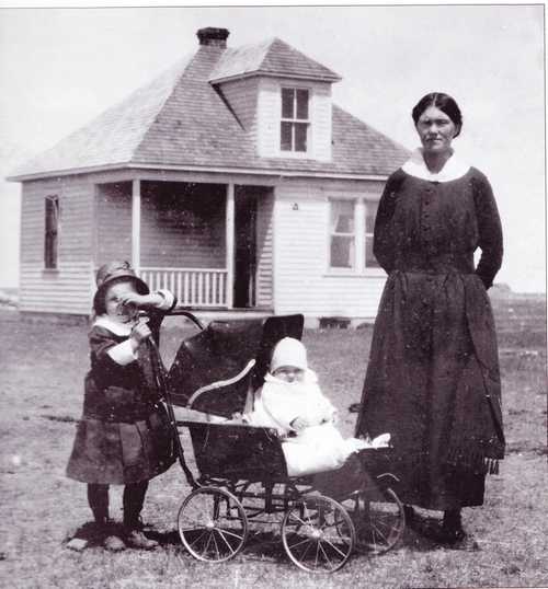 | | Ca. år: 1917, Ragnhild Knutsdtr. Sande f. Loen og døtrene Ragna og Klara framfor huset på farmen ho og mannen Andreas Arneson hadde ved Turner i Montana. Ragna badde ein skuteveg på ontrent 5,5 kilometer og ho brukte å ri til skulen. Landskapet uar heilt flatt, og når det var tjukk skodde eller snøkave, badde Ragna to små hundar som sprang føre hesten for å finne vegen. Ho batt hesten ved skulen, og hundane la seg attmed hesten for a vente til skuldagen var slutt. Det var aldri på tale at vaksne skulle følgje ho. (Foto uttånt au Håkon Loen til Rasmus Sunde) |  |